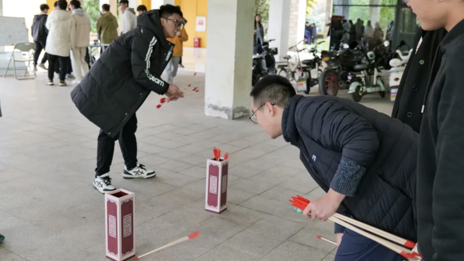 “猜灯谜”活动同样人气高涨。红色的灯笼下,各式各样的灯谜激发了同学们的思考和讨论。猜出谜底后,他们还可以参与小乒乓球赛、脚扔沙包等活动,积攒积分,赢取奖品。