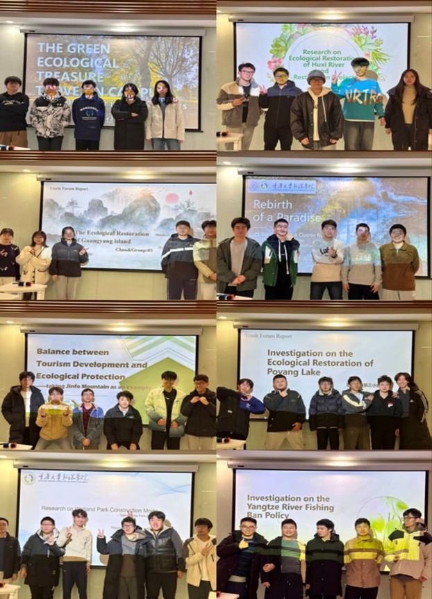 在此次青年论坛上,同学们被分为8个项目小组进行汇报,项目内容覆盖了“可持续发展”这一核心主题的多个方面。从虎溪校园植物多样性的调查、虎溪河的河流生态保护,到璧山秀湖湿地公园的建设和金佛山生态型旅游的开发;从九寨沟震后的重生、鄱阳湖生态困境的突破,到长江十年禁渔政策的实施和广阳岛生态建设的新篇章。每个项目小组都以独特的视角和深入的研究,展现了他们对主题的理解和探索。